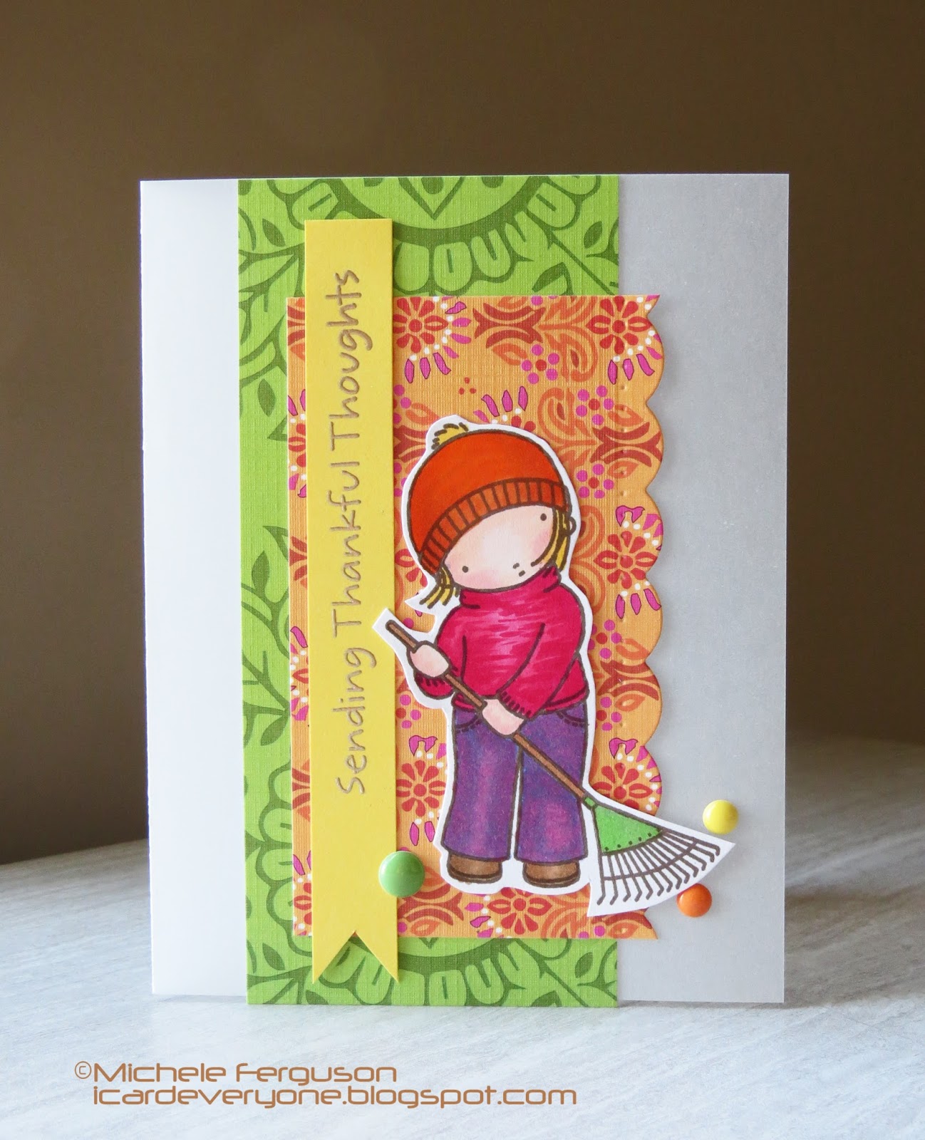 What a sweet card, Michele! I really like the background papers you chose. They look cheery. I adore the colors you chose for your sweet girl raking up the leaves. Those pants have a lovely hint of pink, too. Wonderful work leads to a beautiful card. Thanks for sharing. Have a happy day! :)